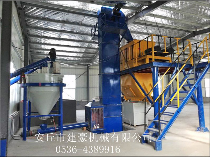 简易型、半自动型、全自动型三种。简易型主要由无重力混合机、干粉料仓、包装螺旋等构成。该生产线投资少,见效快,但产量低,且人工消耗特别大,工作环境含尘量较高,适合投资初期购买。半自动型主要由无重力混合机、成品料仓、包装机、斗式提升机、待混仓、除尘器、空压系统、控制系统等构成。该生产线投资较简易型较大,但产量高、工作环境好,且可拓展性好,适合大部分投资人士选购。全自动型主要由混合系统、储料系统、输送系统、提升系统、称量系统、待混系统、包装系统、除尘系统、料位控制系统、报警系统、空压系统、整机控制系统等构成。商品砂匮乏的地区,可以增配破碎系统、筛分系统、烘干系统。该生产线投资大,一步到位,投资风险大,适合建在墙体保温基础较好的大中型城市。